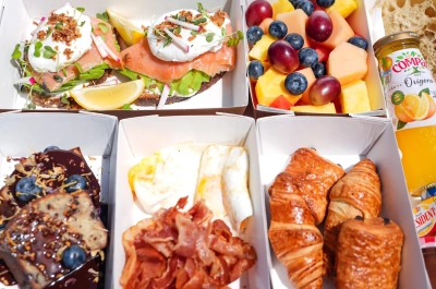 Saumon fumé, Toast à l’avocat, Oeuf poché, Plateau de fromages, Jus d’orange, Beurre & Confiture, Pâtisserie française…