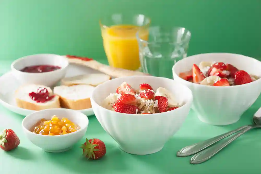 Boisson chaude, Jus de Fruits Frais , Salade De Fruits, Yaourt et Muesli