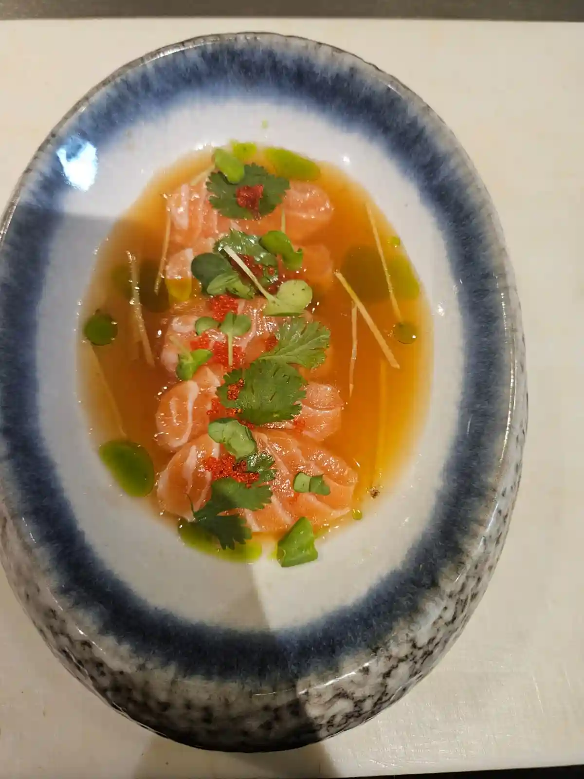Saumon, Gingembre, Litchi et Fruit de la Passion, Huile de Basilic
